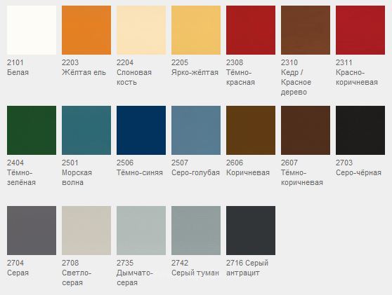 2101 Белая; 2203 жёлтая ель; 2204 Слоновая кость; 2205 Ярко-жёлтая; 2308 Тёмно-красная; 2310 Кедр / Красное дерево; 2311 Красно-коричневая; 2404 Тёмно-зелёная; 2501 Морская волна; 2506 Тёмно-синяя; 2507