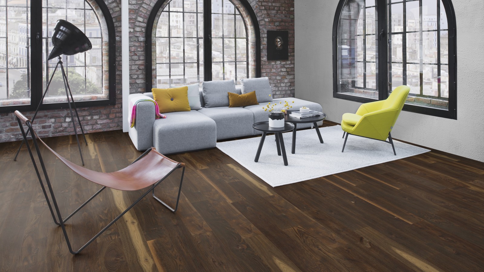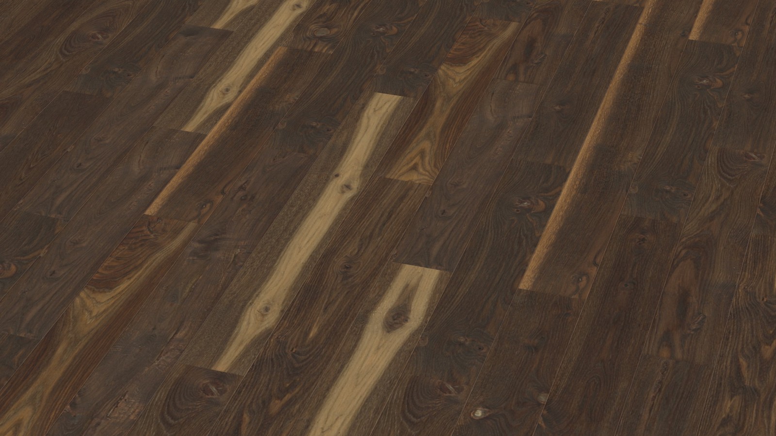 Брашированный дуб, тонированный маслом с пигментом. Сучки и трещины заполнены частично.