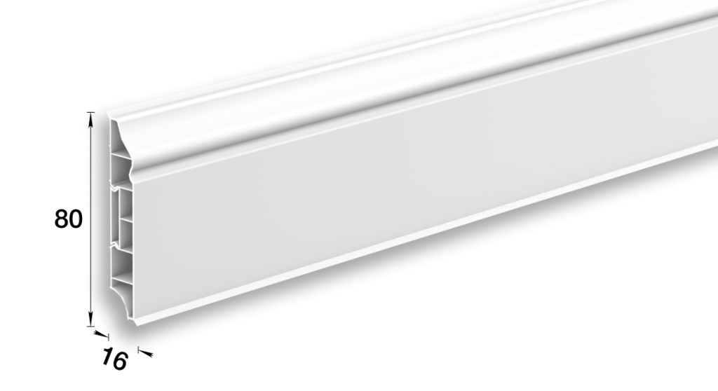 Плинтус ДЮРА 80 выполнен из высококачественного ПВХ-компаунда в виде цельного профиля с внутренними ребрами жесткости и мягкими краями в верхней и нижней частях плинтуса для плотного прилегания к стене и полу. Данная коллекция плинтусов производится с защитным лаковым покрытием и предусматривает возможность окрашивания. Для декоративного оформления прямых и угловых стыков плинтусов предусмотрены наборы накладок, а также наборы прямых и угловых соединителей.