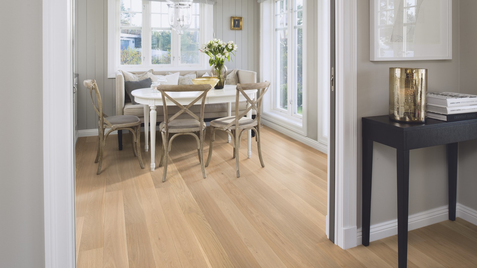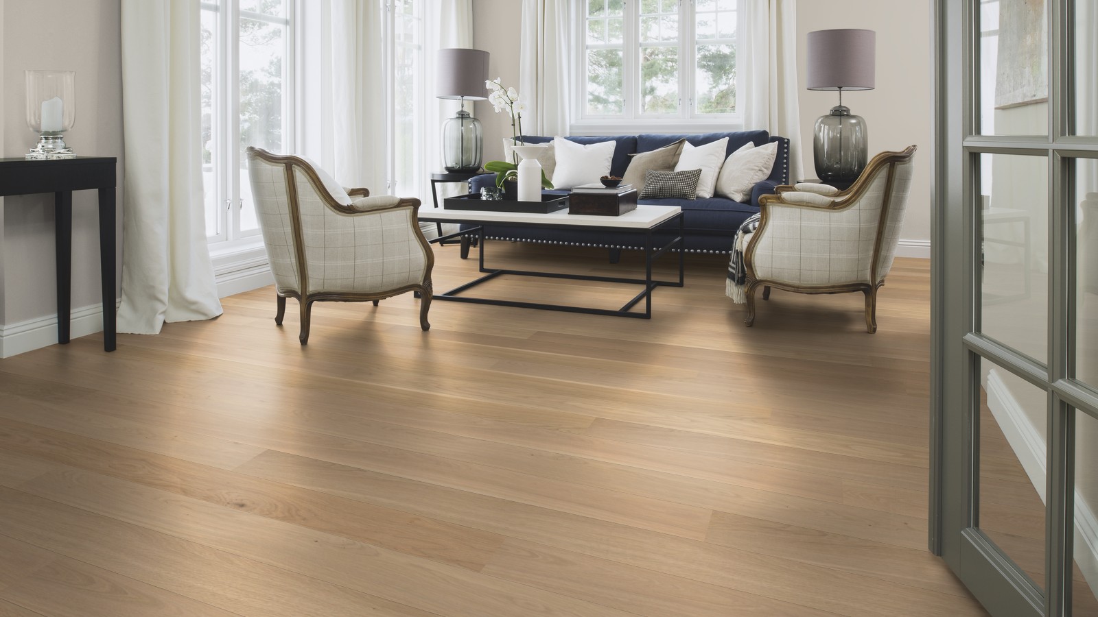 Однополосная паркетная доска дуб Andante 138 браш, фаска, покрытие Live Pure. Благодаря специальной обработке напольного покрытия, Live Pure представляет собой поверхностный слой, который защищает пол от пыли, грязи, жидкостей и химических веществ, хотя в то же время пол выглядит и ощущается как необработанная или отшлифованная сырая древесина. Поверхность, обработанная Live Pure, также отличается лучшей устойчивостью к УФ лучам, чем стандартные покрытия из лака и масла. После укладки пола и во время его использования не требуется никакой дополнительный уход.