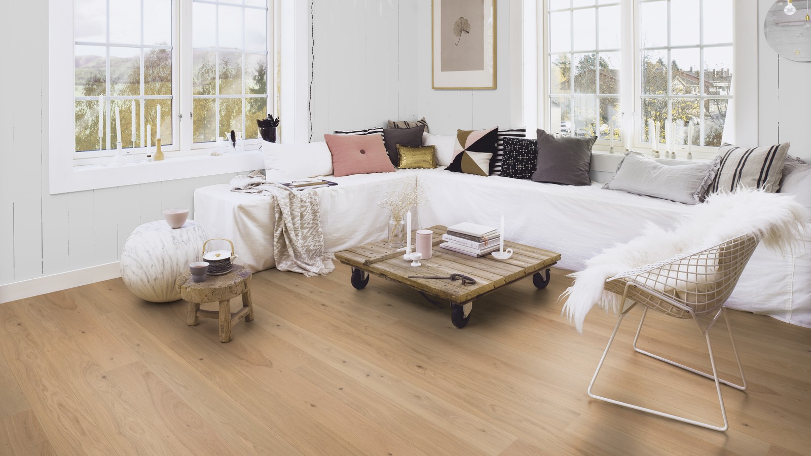 Однополосная паркетная доска дуб Animoso 138 браш, фаска, покрытие Live Pure. Благодаря специальной обработке напольного покрытия, Live Pure представляет собой поверхностный слой, который защищает пол от пыли, грязи, жидкостей и химических веществ, хотя в то же время пол выглядит и ощущается как необработанная или отшлифованная сырая древесина. Поверхность, обработанная Live Pure, также отличается лучшей устойчивостью к УФ лучам, чем стандартные покрытия из лака и масла. После укладки пола и во время его использования не требуется никакой дополнительный уход.
