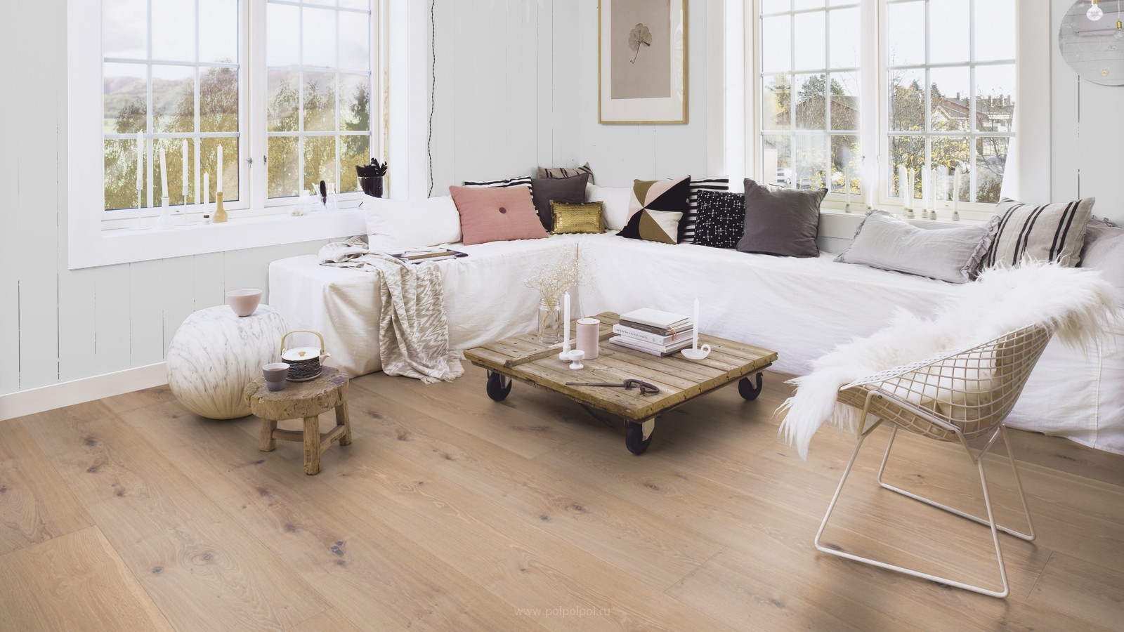 Большие комнаты вдохновляют на декорирование очень широкими досками. Длина доски Шалетино 2.75 м, ширина 30 см.Тщательно спроектированный дизайн. Надёжная 3-х слойная конструкция с износостойким слоем из твёрдой древесины толщиной 4.5 мм была спроектирована для длительной эксплуатации. Фаска с четырёх сторон. Все доски с микро фаской 1 мм под углом 45 градусов вдоль четырёх сторон. Фаска делает акцент на значительную длину и ширину этих больших досок. На длинных сторонах всех досок - шип-паз, на коротких - вставной плоский шип. Доска покрыта маслом с белым пигментом. Браш придаёт доске дополнительную фактуру.