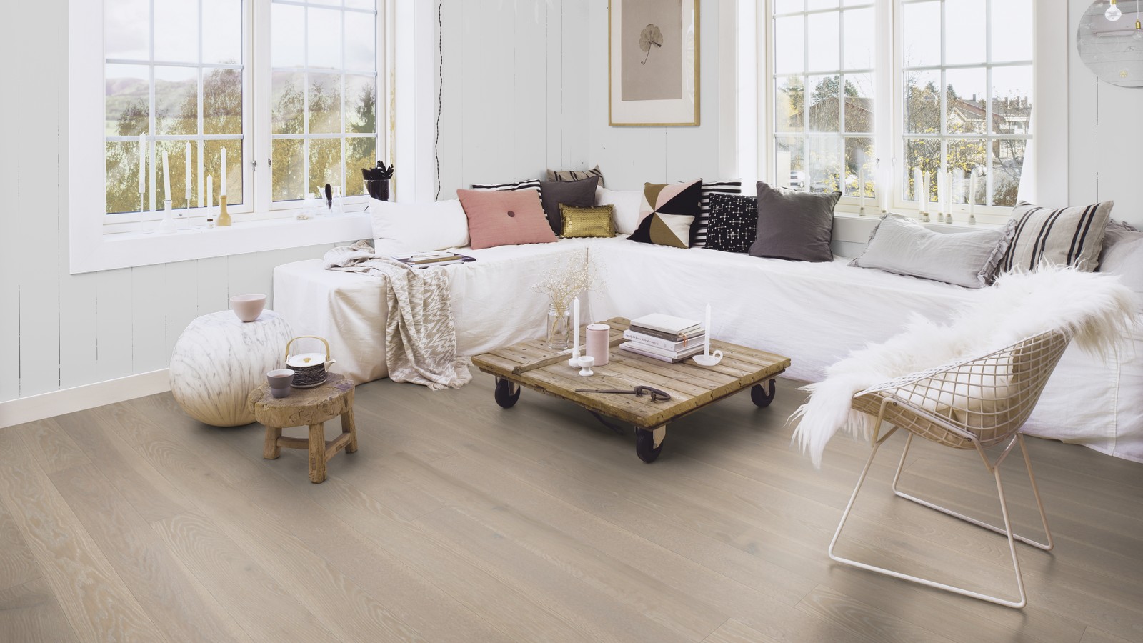 Однополосная паркетная доска дуб Grey Harmony 138 браш, фаска, покрытие Live Pure. Благодаря специальной обработке напольного покрытия, Live Pure представляет собой поверхностный слой, который защищает пол от пыли, грязи, жидкостей и химических веществ, хотя в то же время пол выглядит и ощущается как необработанная или отшлифованная сырая древесина. Поверхность, обработанная Live Pure, также отличается лучшей устойчивостью к УФ лучам, чем стандартные покрытия из лака и масла. После укладки пола и во время его использования не требуется никакой дополнительный уход.