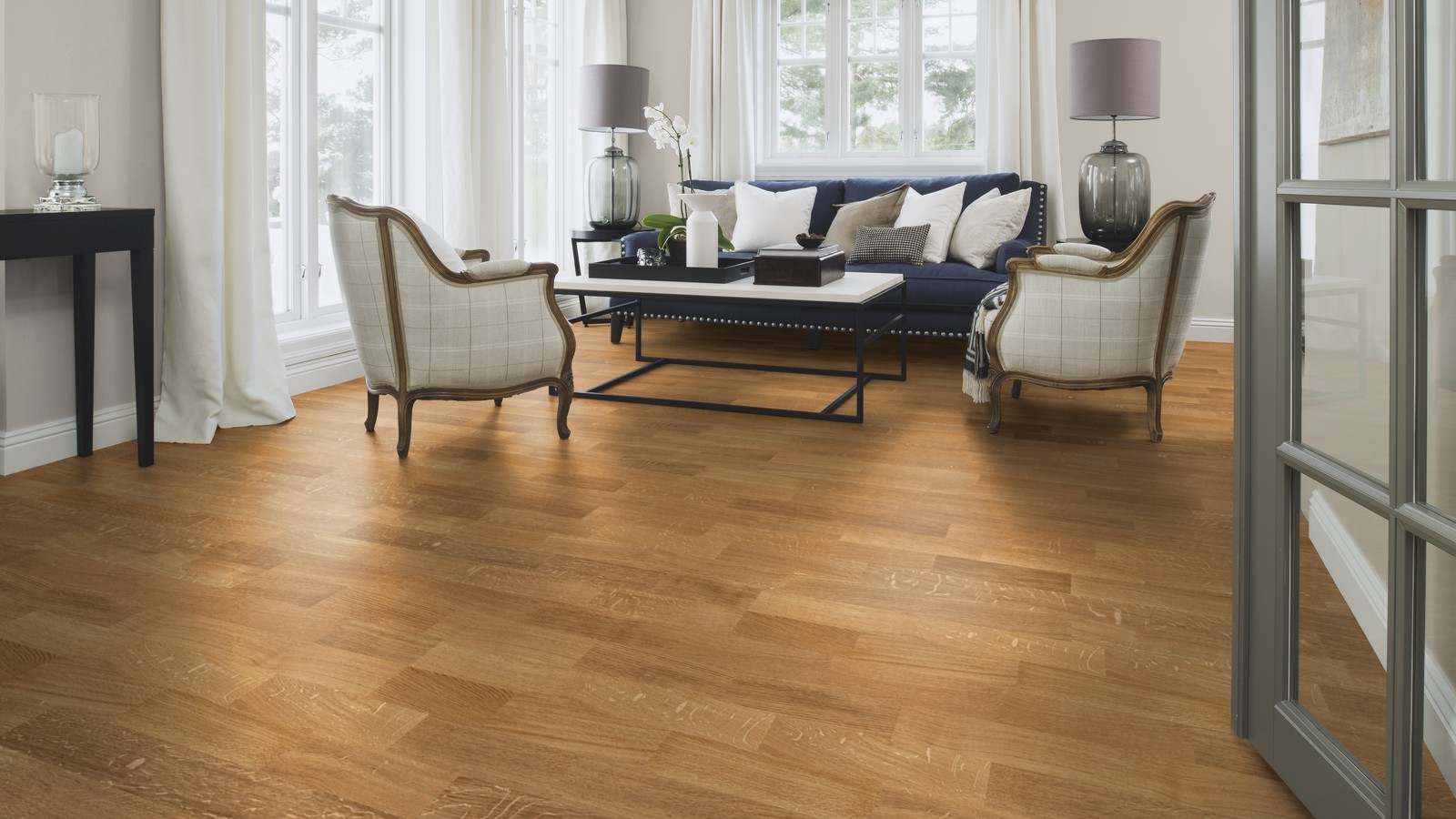 Трёхполосная паркетная доска дуб Адажио,без фаски, покрытие полуматовый лак