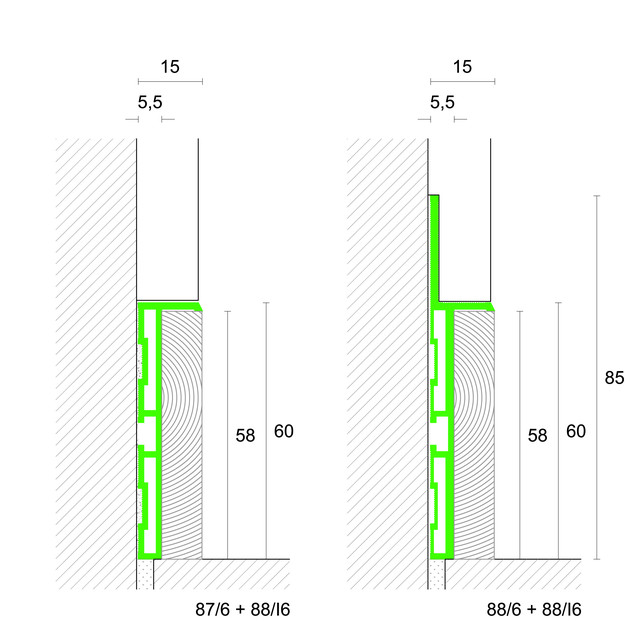 Монтаж производится в 2 эатапа: база крепится при черновой отделке, затем после штукатурки и монтажа напольного покрытия монтируются декоративные вставки
